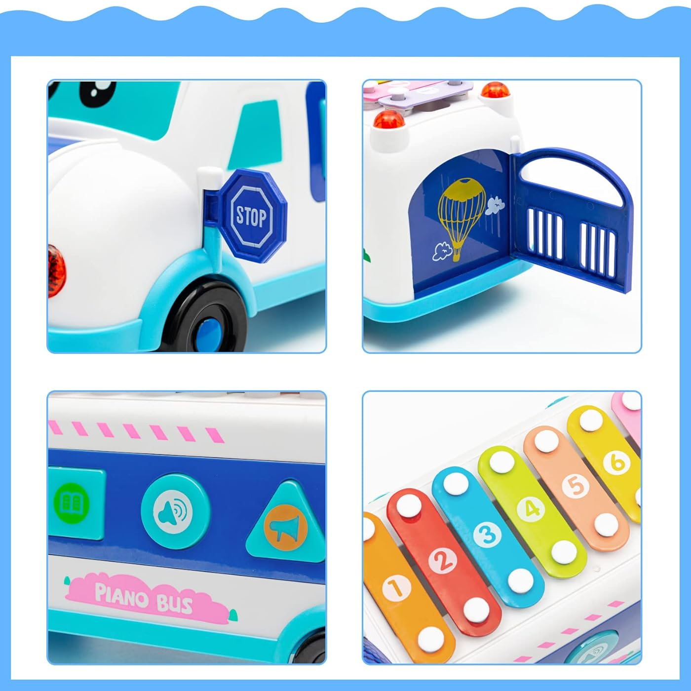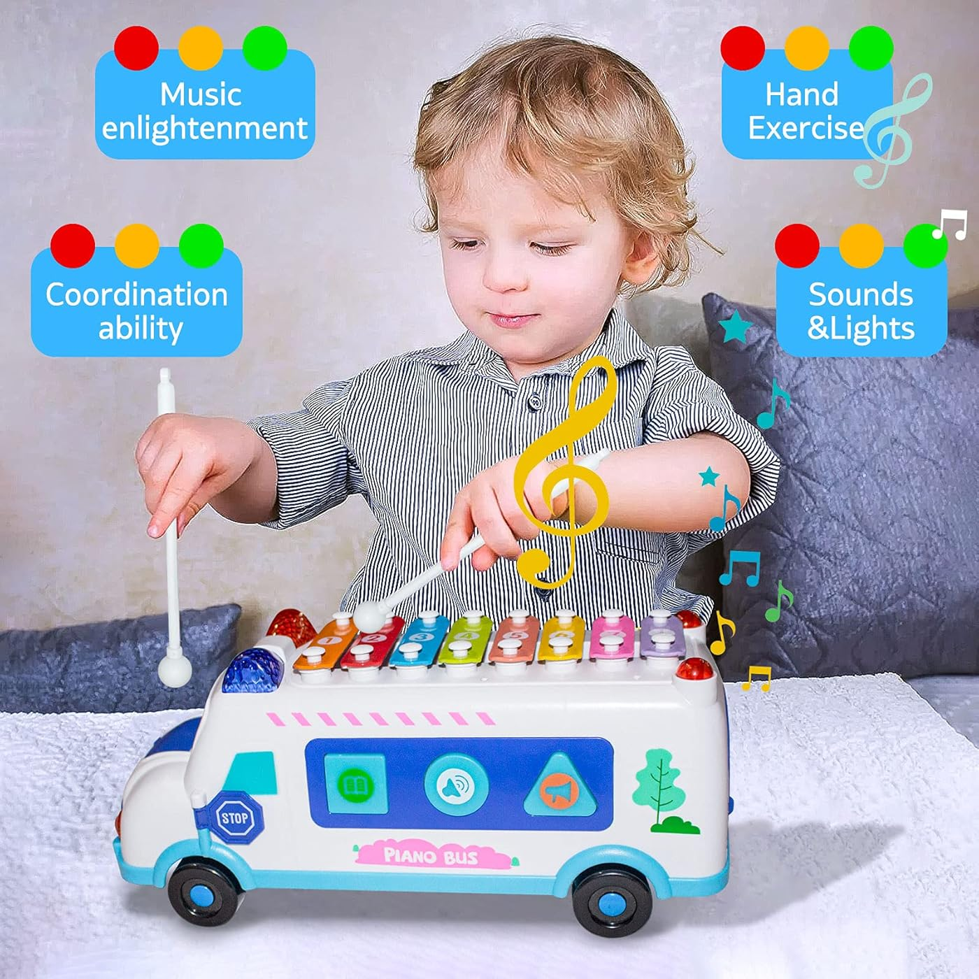 Con su estructura robusta y ruedas para empujar, el autobús también puede moverse, lo cual anima a los niños a arrastrarlo, empujarlo o simplemente observarlo mientras produce música y luces. Es ideal tanto para el juego solitario como para compartir con otros niños.