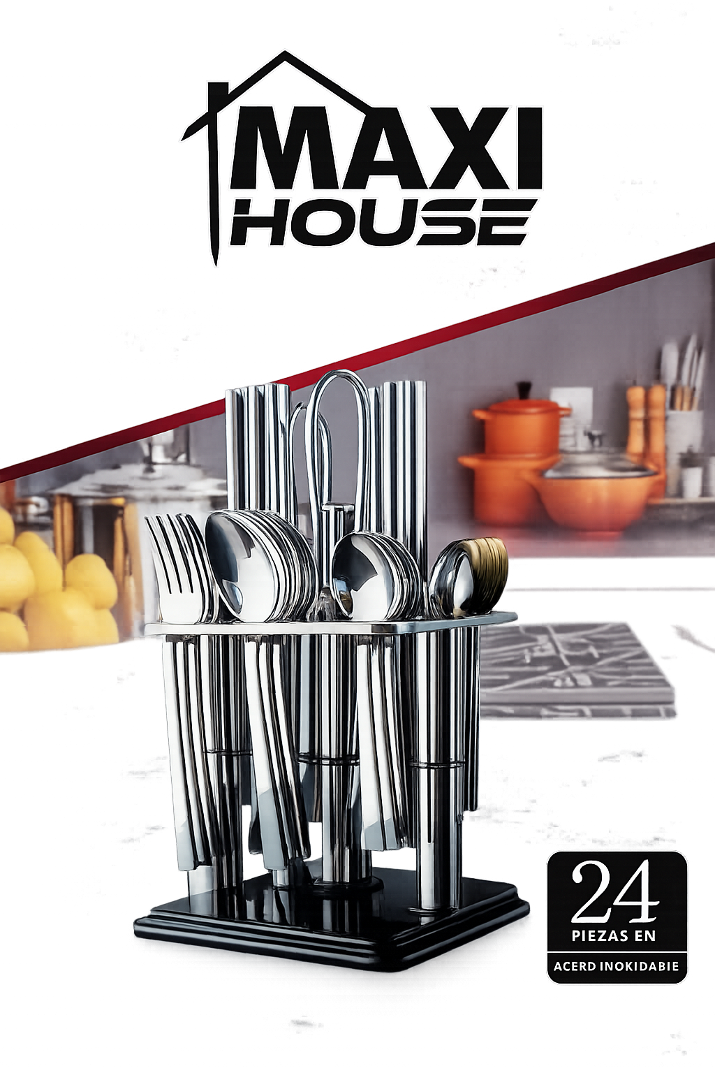 Dale un toque moderno y elegante a tu cocina con este completo set de cubiertos de 24 piezas. Incluye una práctica base organizadora giratoria que permite mantener todo en orden y al alcance, ideal para el uso diario en el hogar.